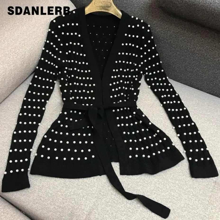 Hot Product Pearl Beading Long Sleeve Cardigan Black V-Neck Women Elegant Winter Sweater