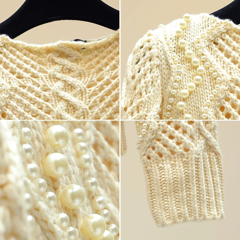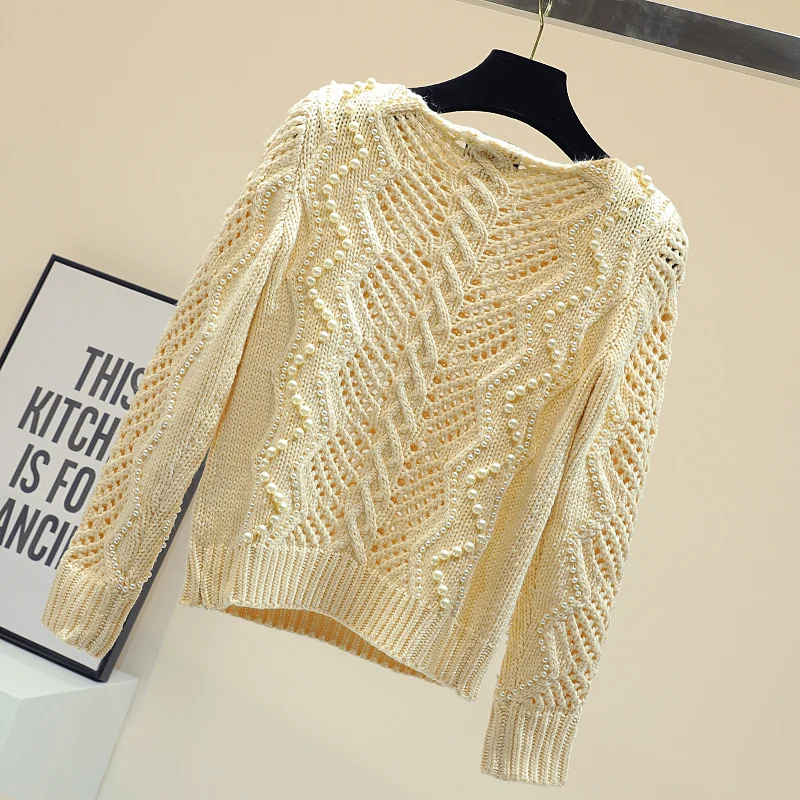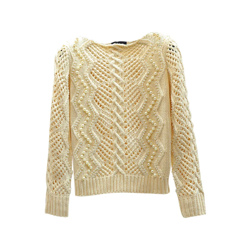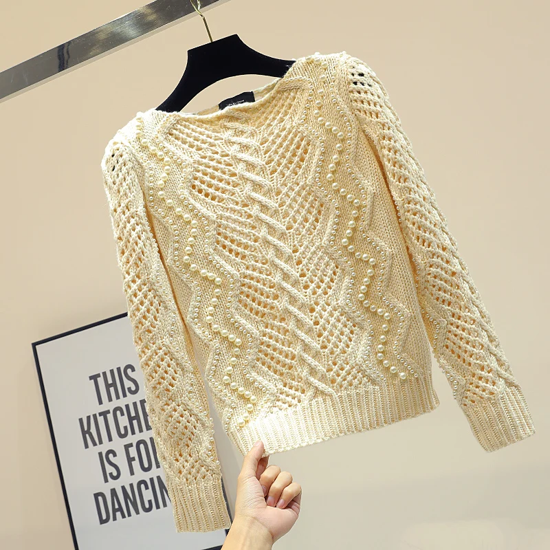New Arrival Pearl Bead Hollow Pullover Sweater for Women Spring Autumn Sweaters Girls Ladies Temperament Slim K