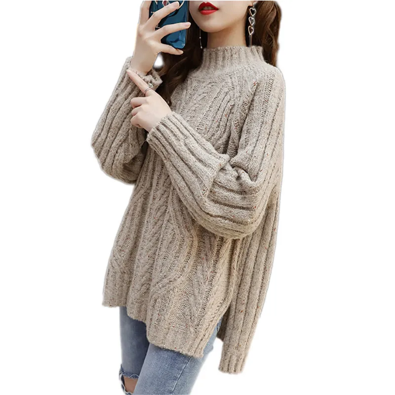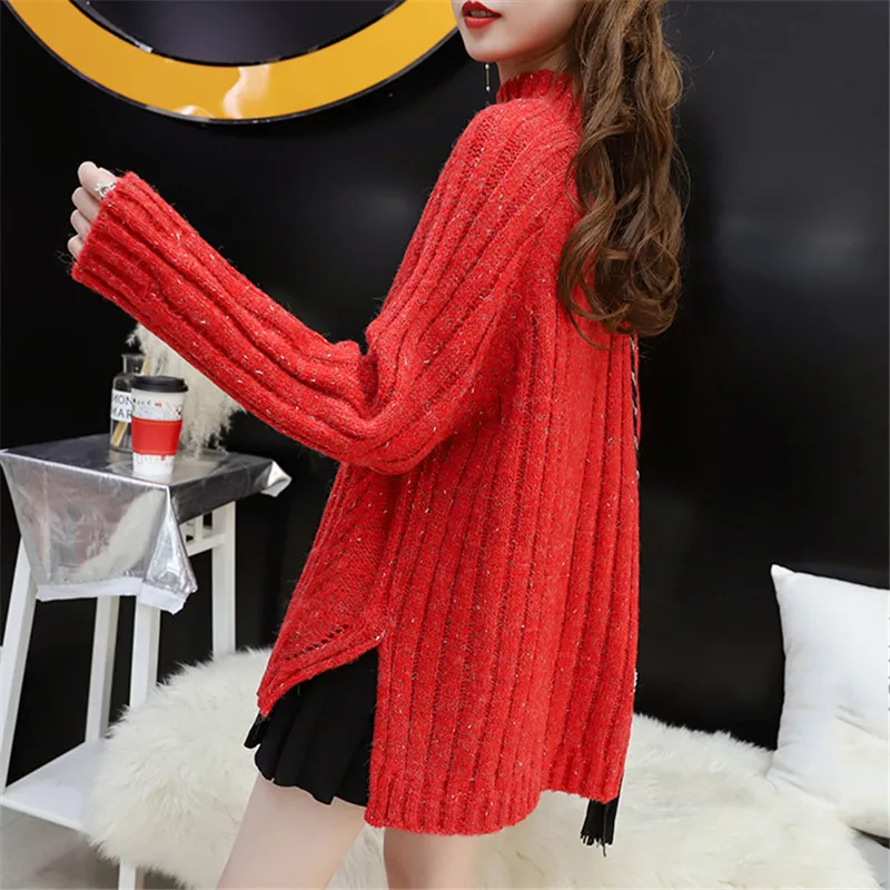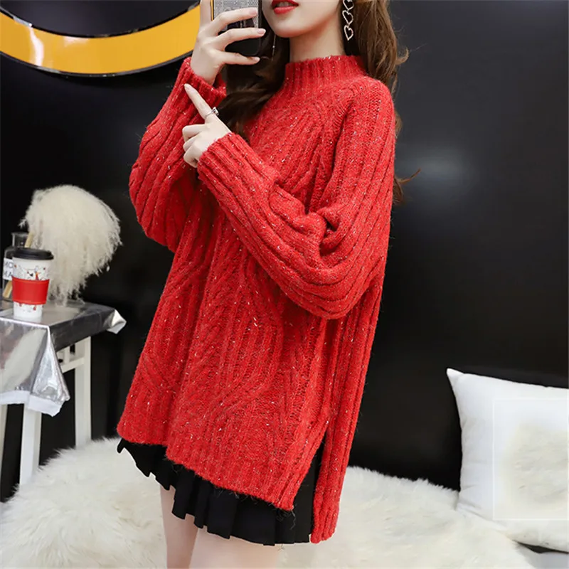 Big Discount Ladies Sweater Spring Autumn 2019 New Medium Long High Collar Knitwear Loose Padded Pullover Wild W