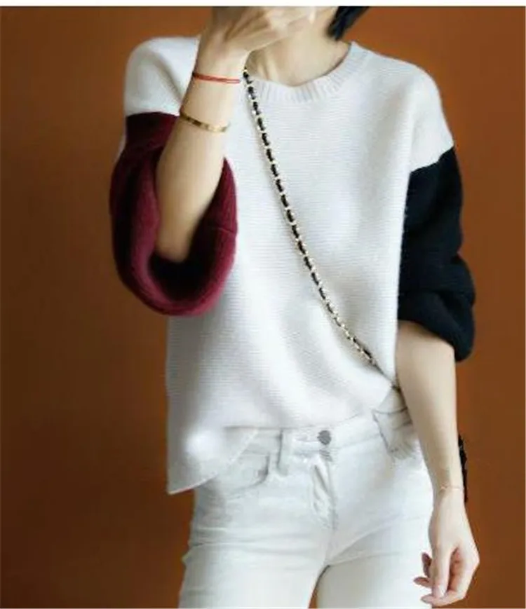 Buy 100%goat cashmere knit patchwork color women wide loose sweaters pullover Oneck lantern sleeve S/M/