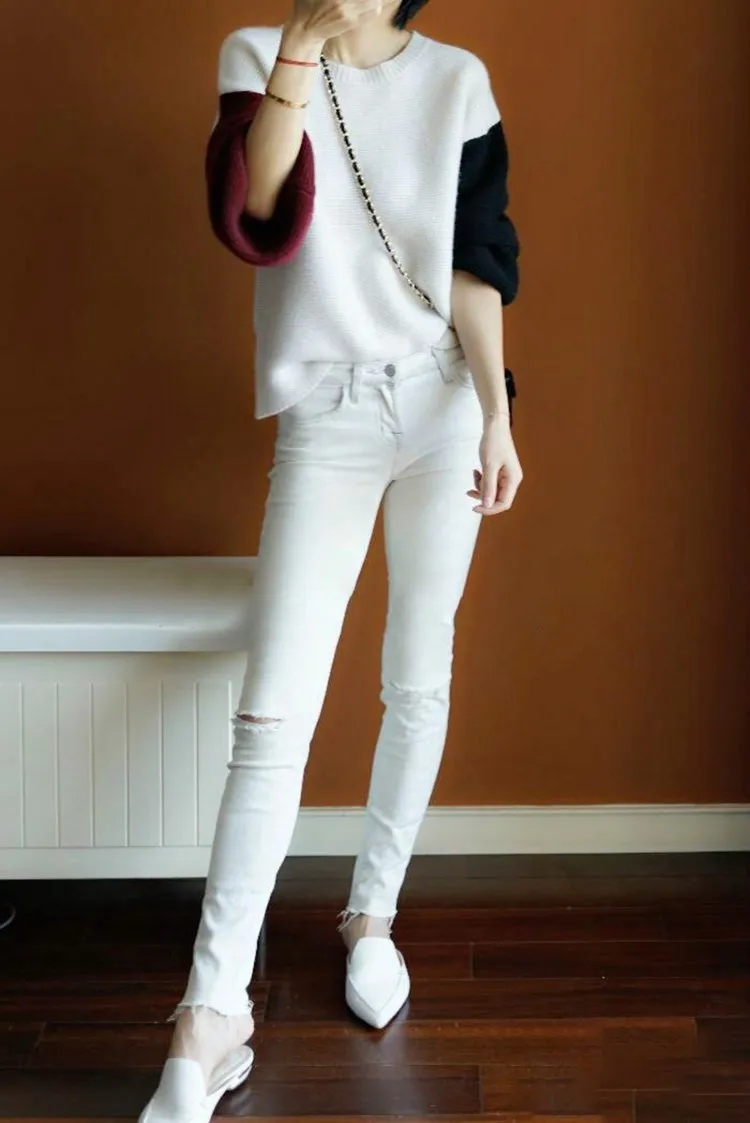 Wholesale 100%goat cashmere knit patchwork color women wide loose sweaters pullover Oneck lantern sleeve S/M/