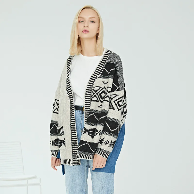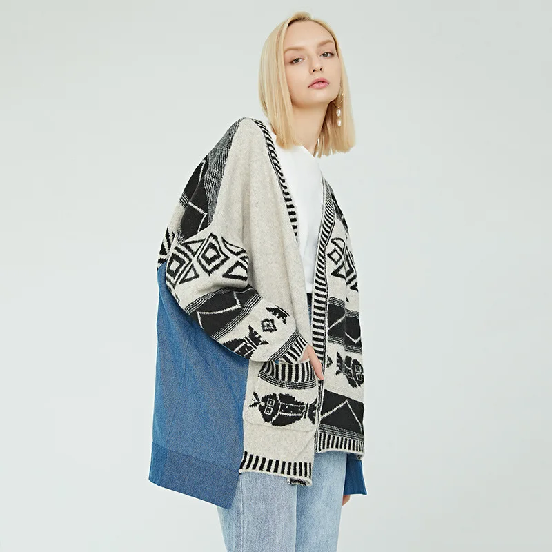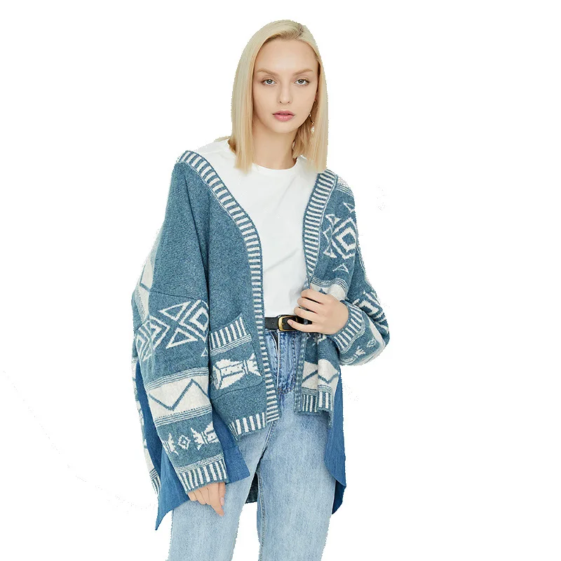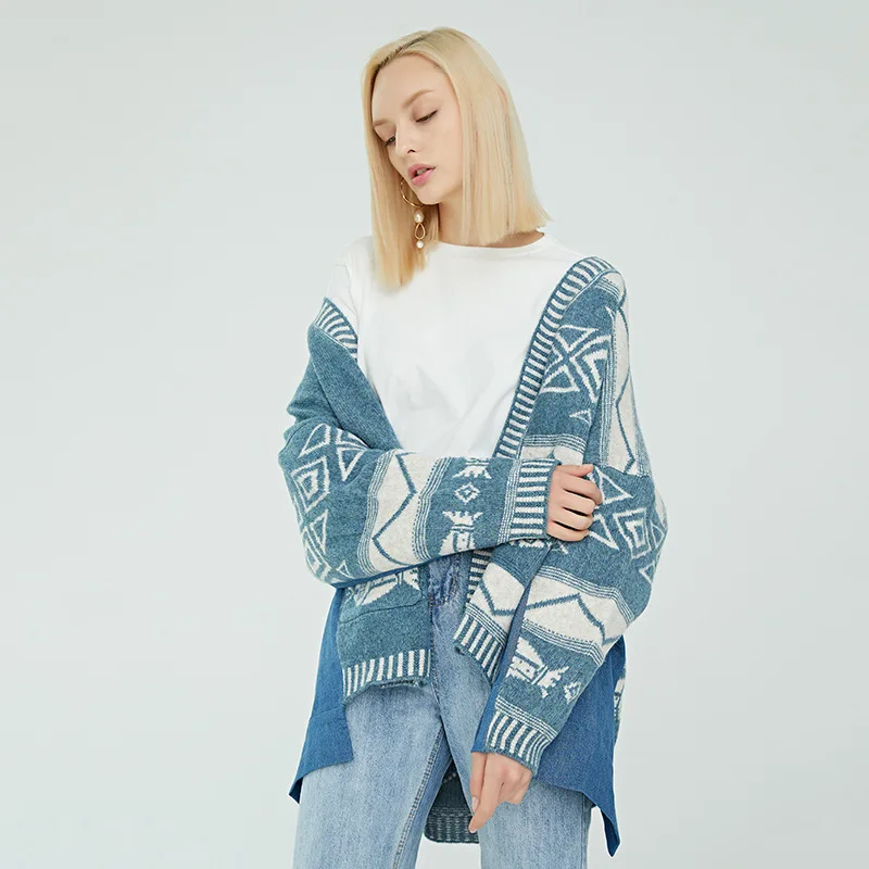 Wholesale Autumn/winter Women Sweater Irregular Denim Stitched V-neck Wool Knitted Cardigan Fashion Loose Cas