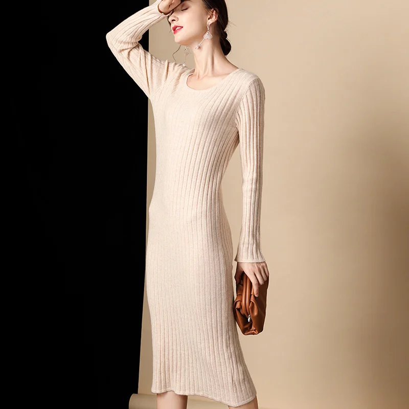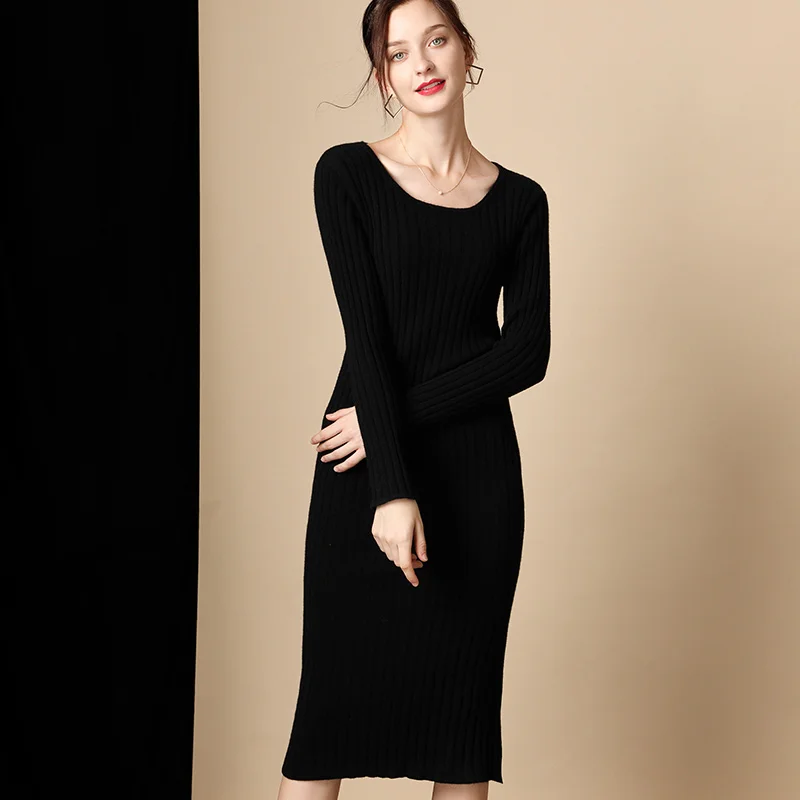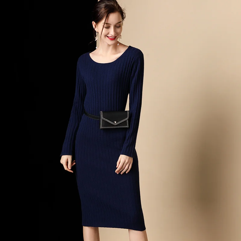 Hot Promo Smepvrg pure wool lady dress women sweater O-neck long sleeve slim female pullover long dress sweat