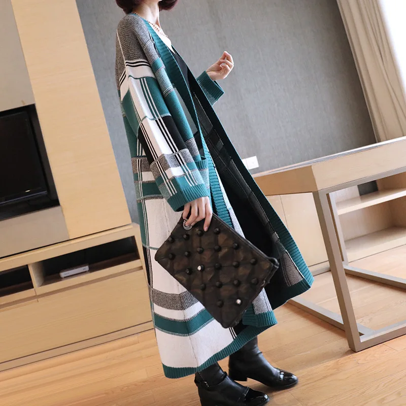 Cheap Long Thickened Knitted Overcoat Large Plaid Female Spring Autumn 2019 Chequered Sweater Korean Fash