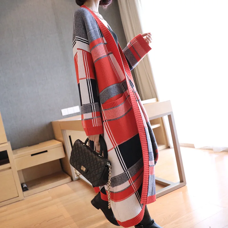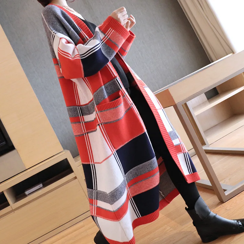 Promo Long Thickened Knitted Overcoat Large Plaid Female Spring Autumn 2019 Chequered Sweater Korean Fash